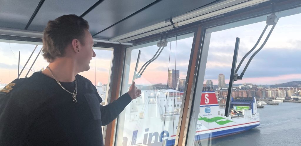 Patrik Österberg visar ett passerande Stena-fartyg som delvis drivs av el.